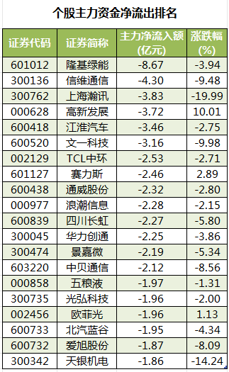 此外,3474只个股被主力资金净卖出,其中,51股被主力资金净卖出超1亿元。主力资金净流出最多的个股是隆基绿能,净流出金额为8.67亿元;主力资金净流出居前的个股还有信维通信、上海瀚讯、高新发展、江淮汽车、文一科技,净流出金额分别为4.3亿元、3.83亿元、3.72亿元、3.46亿元、3.16亿元。