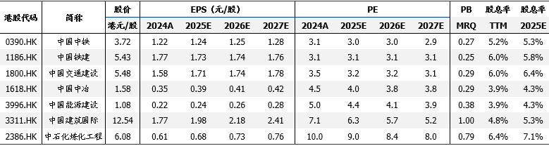 对保险等长周期资金来说,建筑央企港股配置性价比凸显。监管政策积极引导中长期资金入市,证监会等六部委印发《关于推动中长期资金入市工作的实施方案》,预计增量中长期资金将重点投入至业绩稳健、股息率高、市值较大的标的。同时根据税务规定,内地机构连续持有H股满12个月取得的股息红利所得,依法免征红利税(最高所得税率25%),进一步从税收优惠方面鼓励长期持股。因此对于保险等持股周期长(如大于一年)的机构投资者来说,建筑央企港股估值极低、股息率高,长期配置的性价比凸显,后续有望获得长期增量资金流入。
