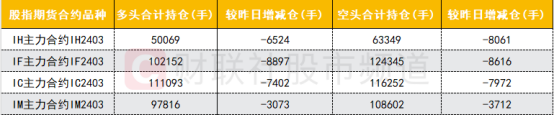 四大期指主力合约多空双方均大幅减仓,其中IH空头减仓数量明显大于多头;IF合约多空双方减仓数量基本相当;IC、IM合约空头减仓数量较多。