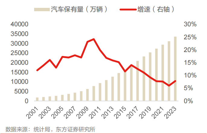 自2000年起,我国民用汽车保有量进入较快增长阶段,至2009~2013年达到增长高峰,年均增速达到20%,2015年起保有量增速开始趋缓,但汽车保有量已经累积超过1.5亿辆,至2023年,全国汽车保有量达到3.4亿辆,保有量高速增长已过。