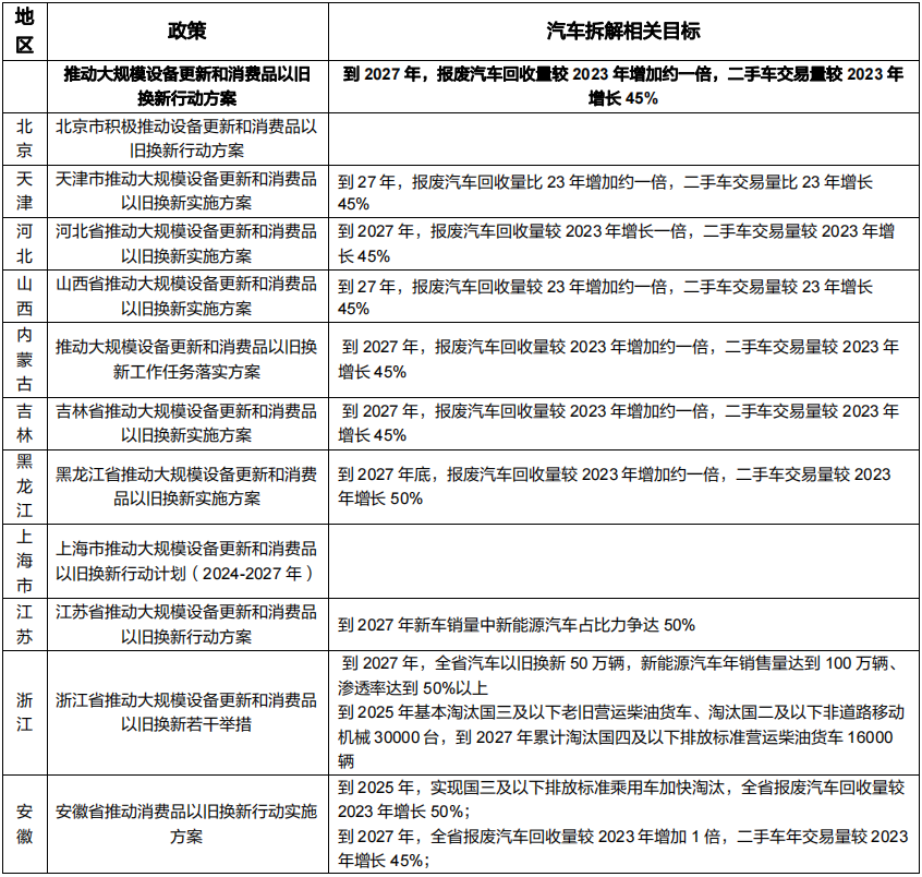 在此之后,各地出台了地方实施方案。据统计,截至5月12日,31个省、直辖市、自治区中已有27个出台了地方性实施方案,其中25个地区的实施方案中提出了关于报废汽车回收及二手车交易量的目标,大多数地区沿用了国务院《行动方案》中2027年的目标描述,少数地区根据当地情况提高了目标,并有地区将目标进行了年度拆解。