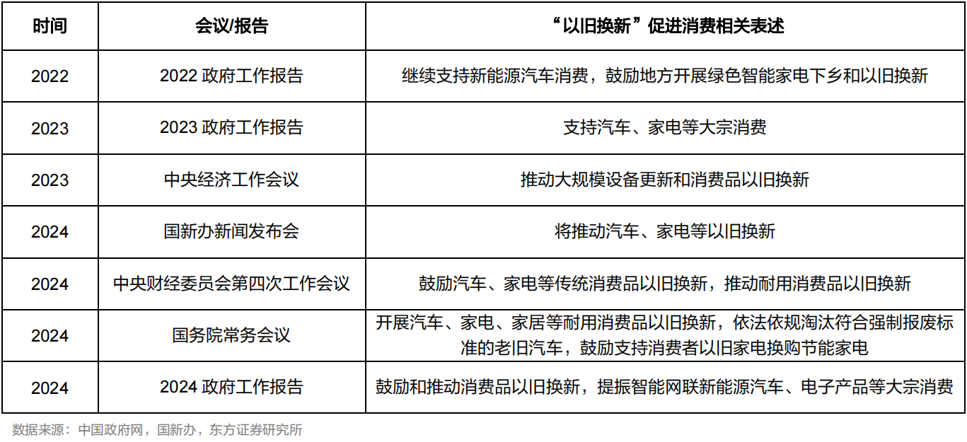 回顾近年政府工作报告及重要会议,“以旧换新”作为促消费的工作重点已见端倪。2023年12月,中央经济工作会议上提出推动大规模设备更新和消费品以旧换新;进入2024年,国新办新闻发布会、中央财经委员会、国常会等多个场合均就推动以家电、汽车等为代表的耐用消费品“以旧换新”作出表述。