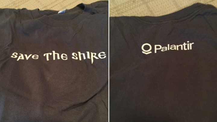 大数据软件公司Palantir甚至曾在员工的T恤上印上了“拯救夏尔”(Save the Shire)的标语,这是《指环王》中的一句著名台词。