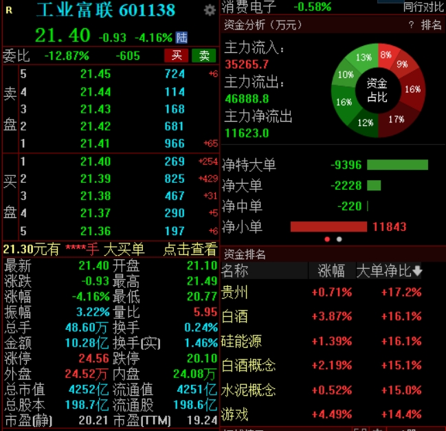 8月5日早盘,工业富联低开低走,截至发稿,该股跌超4%,报21.40元,成交额10.28亿元。