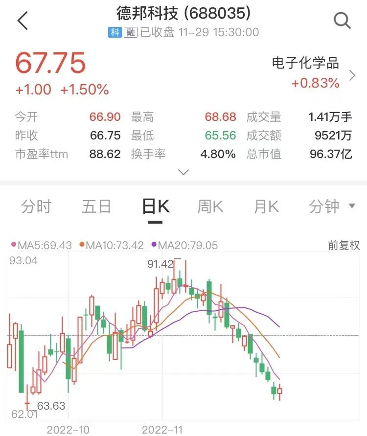 值得一提的是,德邦科技于9月19日登陆科创板,上市仅70余天。截至11月29日收盘,公司股价报67.75元/股,总市值96.37亿元。