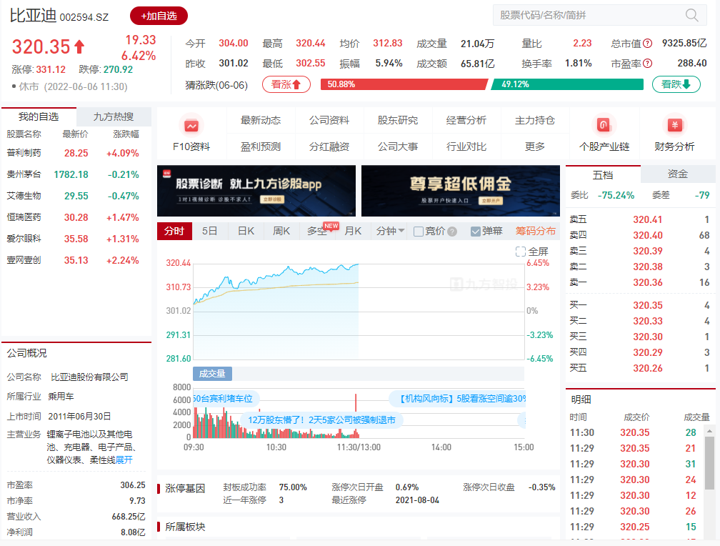 6月6日早盘,比亚迪高开高走,股价刷新年内新高。