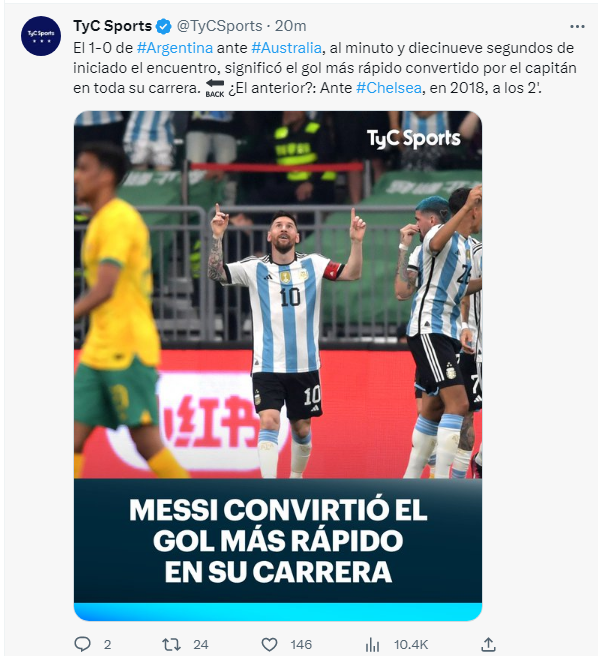 据阿根廷当地媒体报道,这个进球也是梅西职业生涯中的最快进球。此前的纪录是2018年对阵切尔西时的2分06秒。15日,在北京“新工体”,梅西不仅收获进球,还收获了自己的生涯纪录。