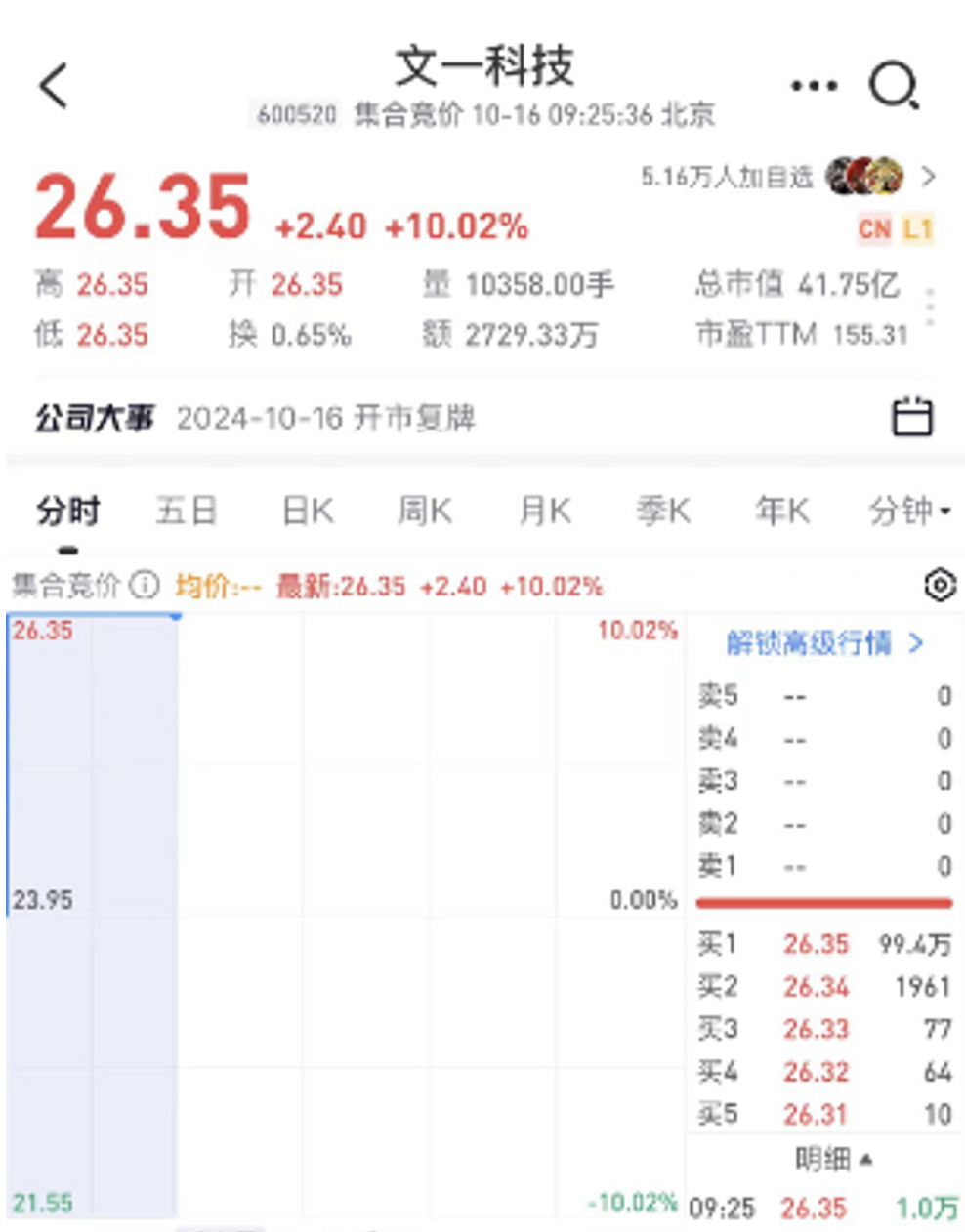 近年来,合肥市国资委被称为“最牛风投”,此前相继押中京东方、蔚来等知名企业。在此消息影响下,文一科技早盘开盘涨停,封单一度接近百万手,达到99.4万手。截至上午收盘,该股报26.35元/股,上涨10.02%。