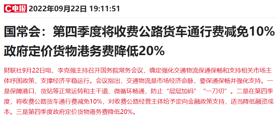 9月22日,李克强主持召开国常会,确定强化交通物流保通保畅和支持相关市场主体纾困政策。其中提到在第四季度将收费公路货车通行费减免10%,同时,第四季度将政府定价的货物港务费降低20%。