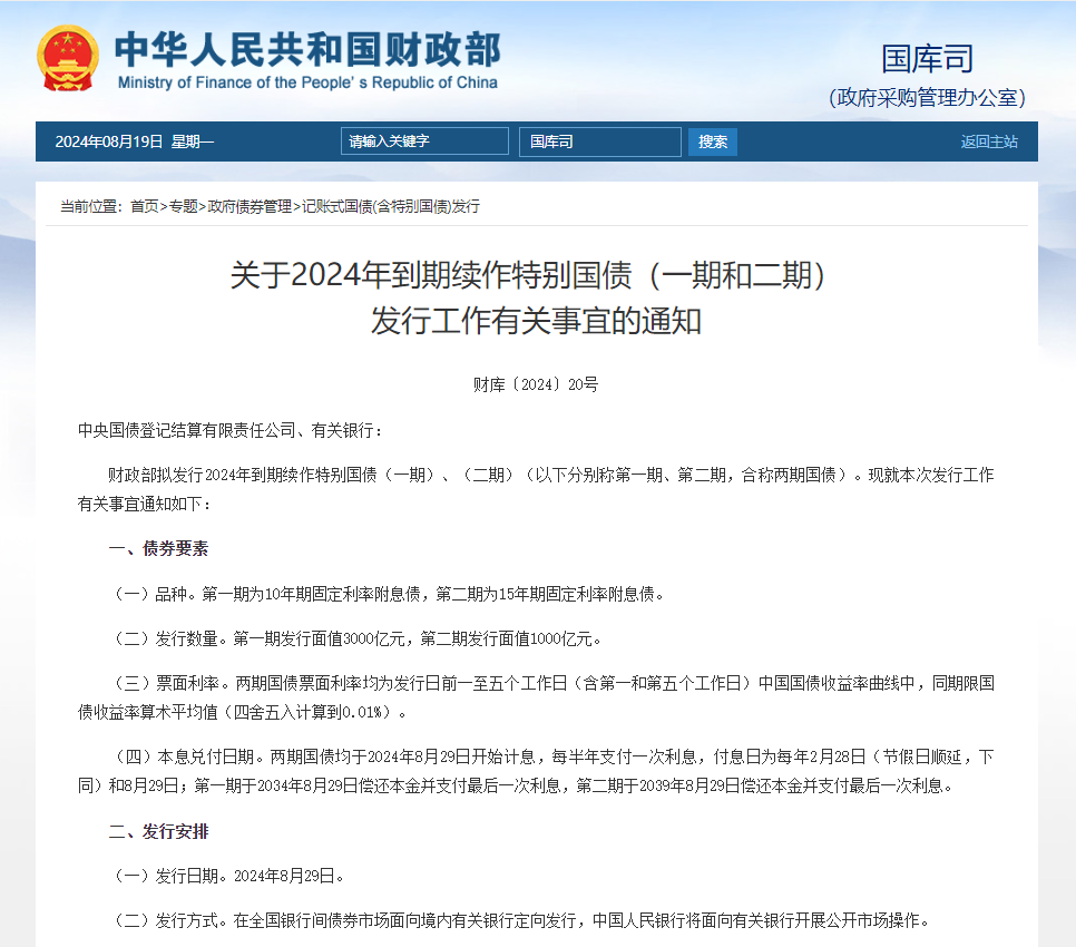 财政部将于8月29日开展2024年到期续作特别国债发行。财政部有关负责人就此接受了记者采访。