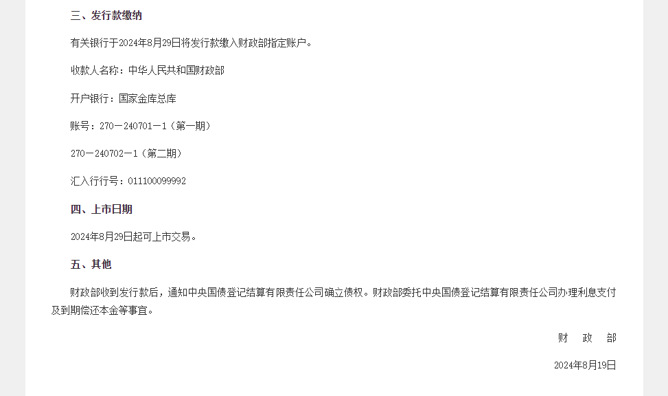 财政部拟发行2024年到期续作特别国债(一期)、(二期)