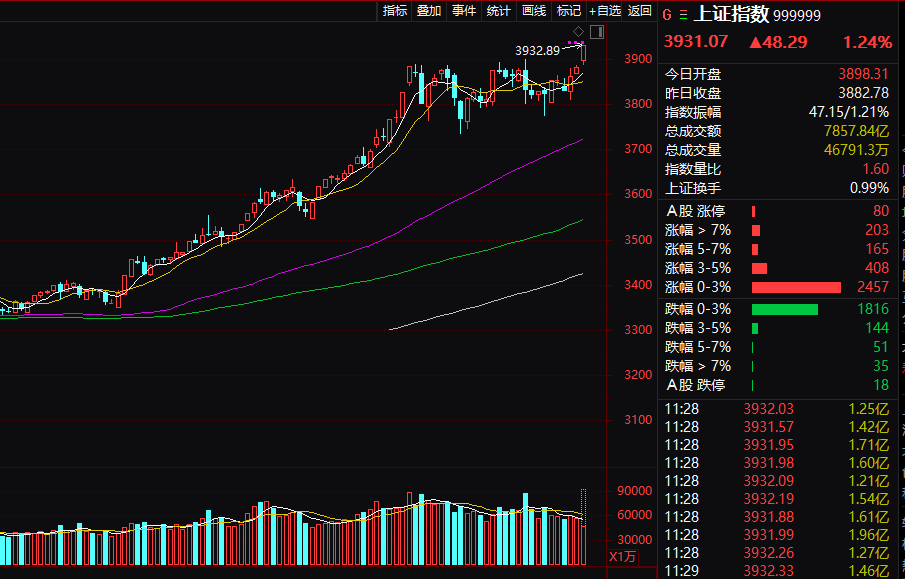 国庆后首个交易日上午,A股市场整体进一步上行,上证指数时隔10年突破3900点。截至午间收盘,沪指涨1.24%,深成指涨1.75%,创业板指涨1.77%。
