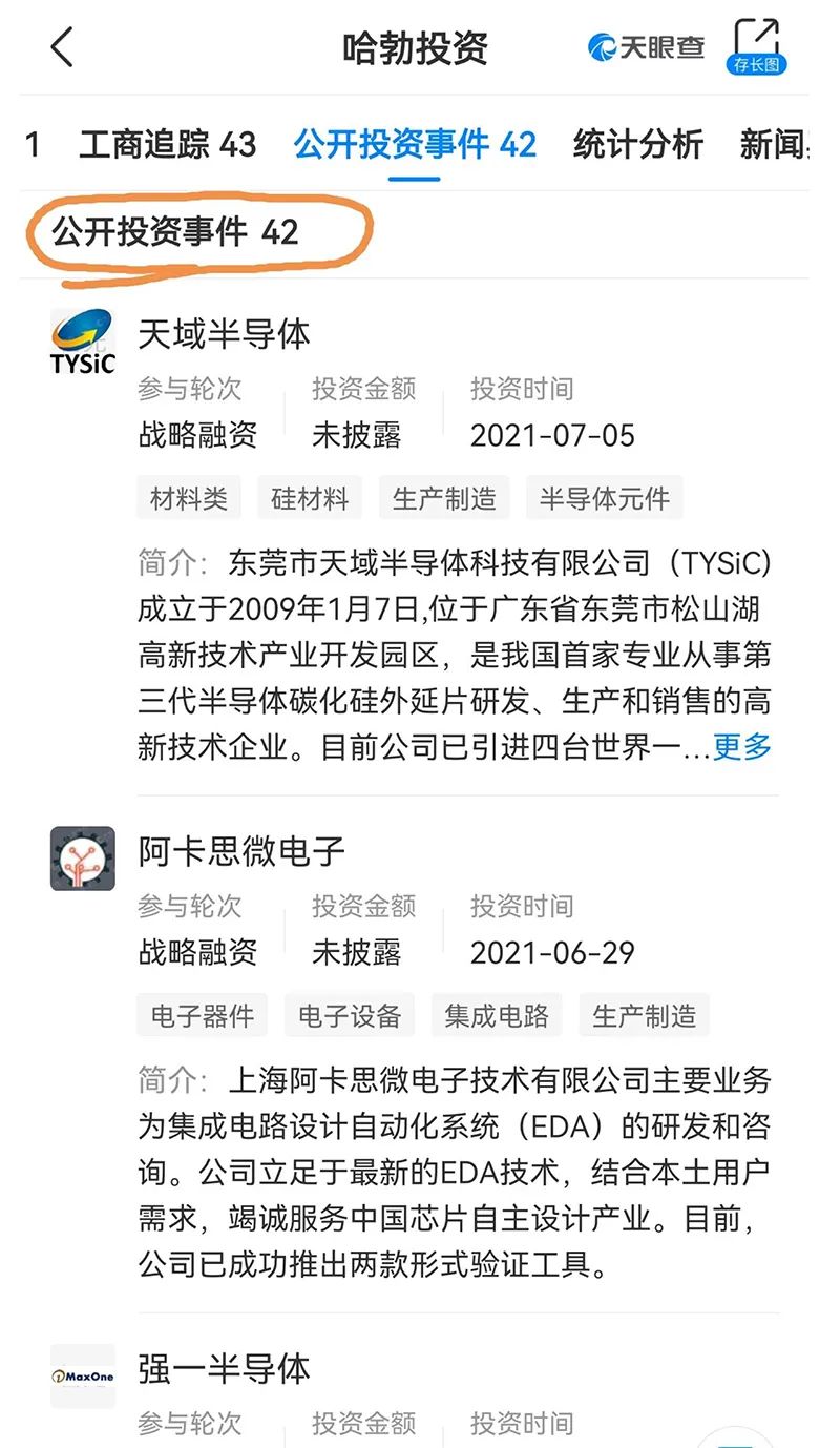 除海思积极布局外,华为的芯片投资载体——哈勃科技投资有限公司,也已经在过去的两年多里投资了42家半导体相关企业,涵盖芯片材料、设备、EDA、设计、测试、封装等多个领域。
