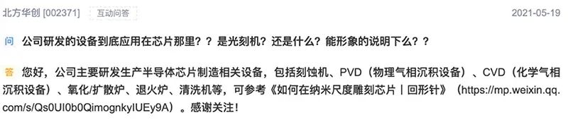 北方华创是国产设备龙头,其在投资者互动平台上称,公司主要研发生产半导体芯片制造相关设备,产品线覆盖刻蚀机、PVD(物理气相沉积设备)、CVD(化学气相沉积设备)、氧化/扩散炉、退火炉、清洗机等。