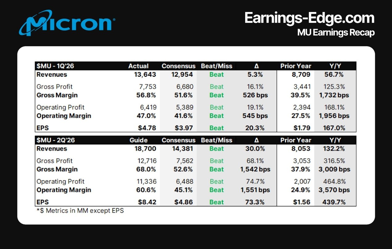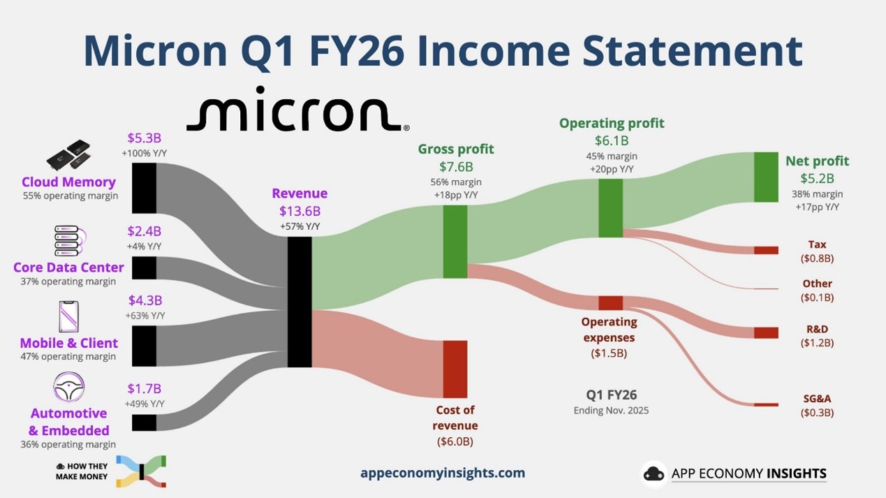 周三(12月17日)美股盘后,在AI数据中心需求爆发、存储芯片供应持续趋紧的背景下,全球存储芯片大厂美光科技公布了好于预期的2026财年第一季度(截至11月27日的三个月)营收和利润,并对当前财季业绩给出了强劲的指引。