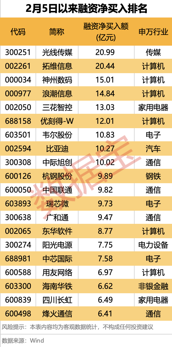值得关注的是,2月5日至今,沪指累计上涨3.95%;而融资客加仓个股则普遍表现优异,净买入5亿元以上个股平均涨幅高达52.12%。光线传媒、优刻得-W、拓维信息、杭钢股份等多股股价已翻倍。