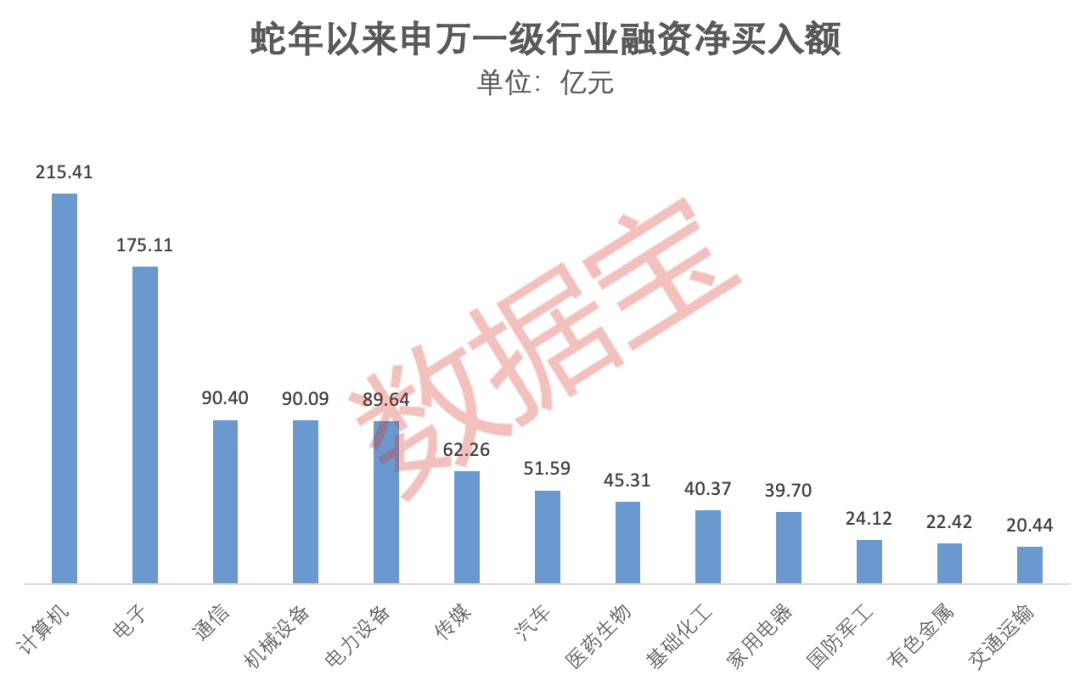 申万一级行业中,计算机、电子、通信、机械设备、电力设备获得融资大举净买入,金额依次为215.41亿元、175.11亿元、90.4亿元、90.09亿元、89.64亿元;仅有综合和食品饮料遭到融资净偿还,金额依次为0.53亿元和1.26亿元。
