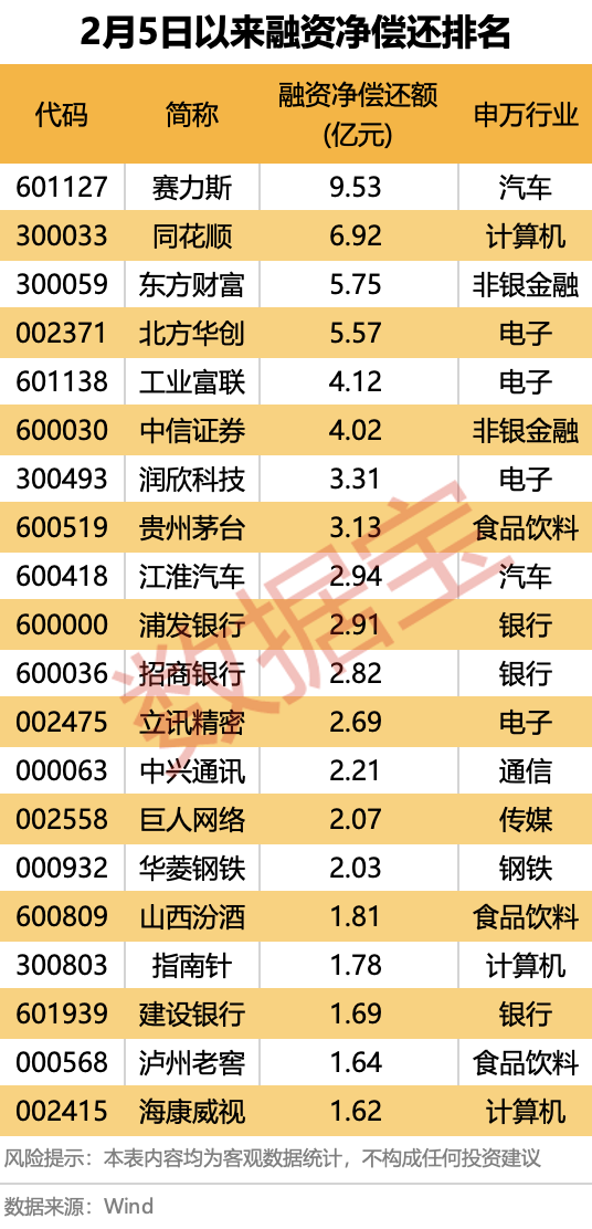 4股融资净偿还5亿元以上,依次为赛力斯、同花顺、东方财富和北方华创。