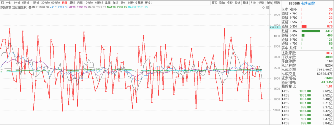 今天,大盘早盘一度冲高,午后持续震荡回落,三大指数均跌1%左右。板块上,大消费板块全线走强,电商概念股领涨,赛维时代20CM涨停,跨境通、联络互动涨停;零售股继续活跃,中央商场5连板,国光连锁、人人乐涨停;服装股盘中活跃,如意集团、美邦服饰涨停;房地产板块一度冲高,荣盛发展、大龙地产涨停。下跌方面,存储芯片、CPO等近期热门的高位题材股出现补跌,华工科技、久远银海跌停。总体上两市个股跌多涨少,近4000股下跌,亏钱效应相当巨大。