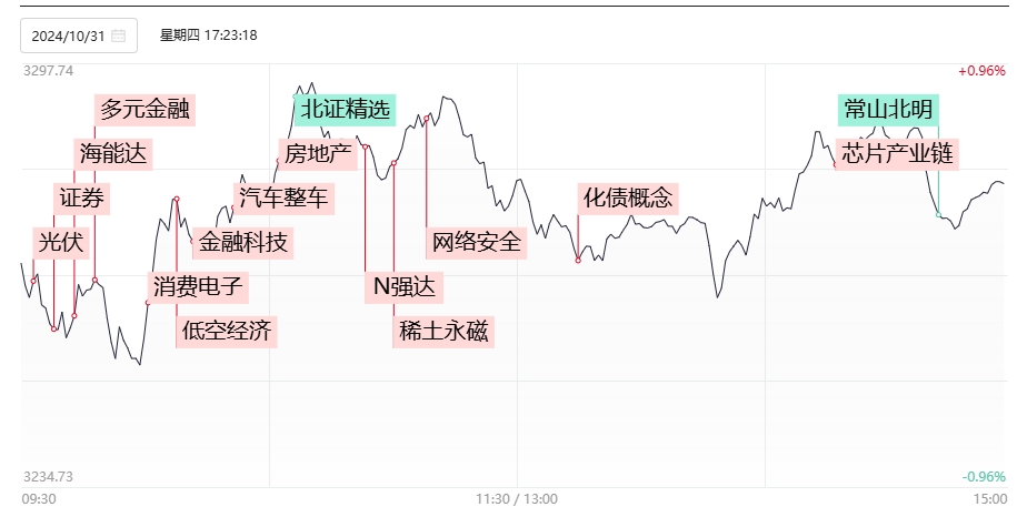 2、券商三季报披露完毕,多家上市券商的第三季单季业绩出现高增,第一创业第三季度归母净利润同比增长近20倍,东北证券同比增幅超过10倍,市场成交量能持续维持万亿元以上,驱动上市券商第四季度业绩预期向好。券商、多元金融两大非银金融板块双双爆发,第一创业、哈投股份、天风证券、中航产融等多股涨停,东方财富一度涨超10%。但大金融板块中两大人气高标中粮资本和银之杰尾盘跟随高位股跳水且承接力度相对不强。而今日同步走强的房地产板块尽管涨停家数不少,但多以叠加化债以及创投等题材品种为主,金地集团一度上板后最终仅收涨不到5%。因此金融、地产板块的拉升更多以维护指数的过渡热点为主。