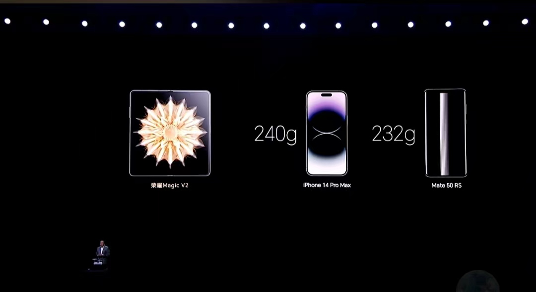 据荣耀CEO赵明介绍,荣耀Magic V2重量仅231克,比苹果iPhone 14 Pro Max、华为Mate50 RS重量都轻。为实现极致轻薄,荣耀Magic V2从设计理念、结构、材料、器件、模组和散热等方面实现了全面重构。闭合态薄至9.90mm,展开态薄至4.70mm,赵明表示,折叠屏手机正式进入了毫米时代。