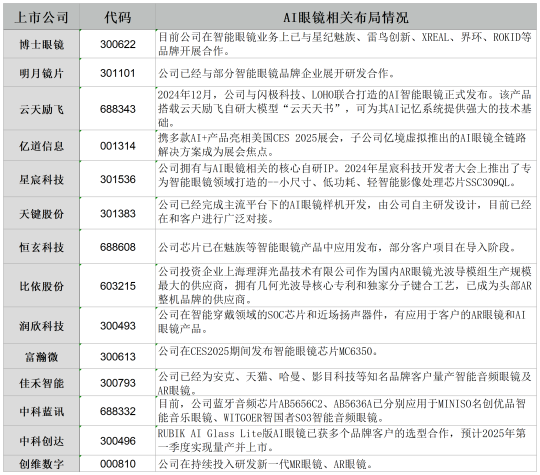 面对即将打开的巨量增长空间,诸多A股上市公司也在积极的布局AI眼镜。