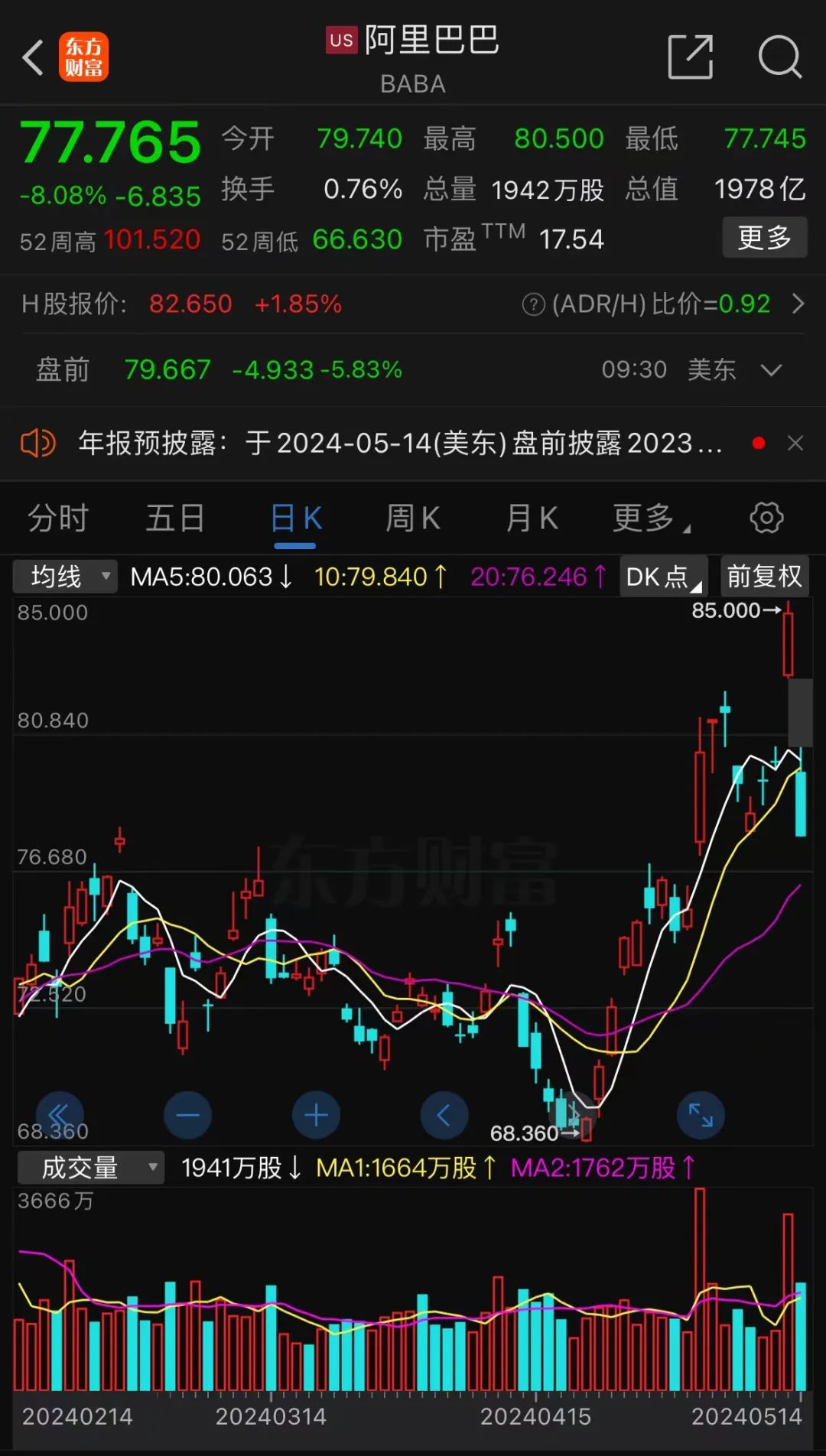 财报出炉后,阿里巴巴美股盘前下跌,开盘后继续下跌超8%。