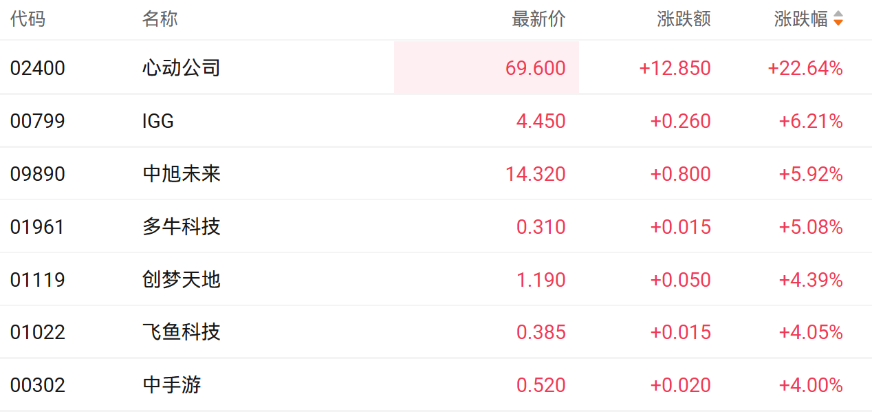 从上图来看,心动公司涨幅居前。该公司公布上半年业绩预期,其中收入不少于人民币30.5亿元,同比增加约37%;预期净利润不少于人民币7.9亿元,同比增加约215%。