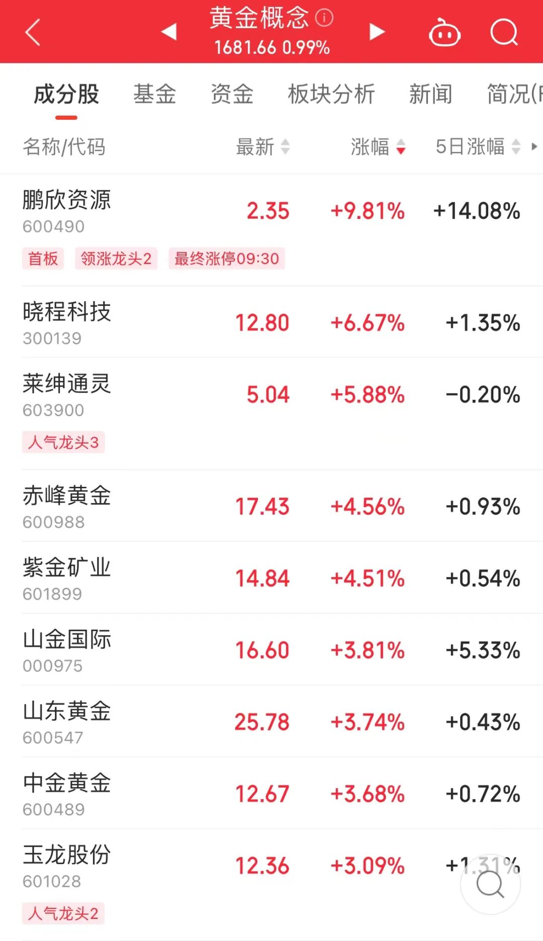 在黄金期货价格创历史新高的情况下,早盘黄金板块有所反弹,黄金概念指数涨近1%,龙头股紫金矿业上午收盘涨4.51%,市值超3800亿元;莱绅通灵、赤峰黄金、中金黄金等多只个股涨逾3%。