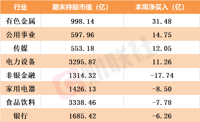 从各行业的资金流向看,有色金属(锂业为主)是本周净买入额之最,金额达31.48亿元。公共事业、传媒、电力设备整体净流入均超10亿元。非银金融抛压较重,净卖出额达17.74亿元。家用电器、食品饮料、银行的净卖出额分别为8.5亿元、7.78亿元、6.26亿元。
