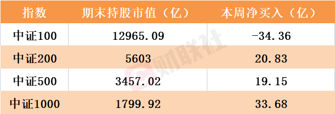 分市场板块看,创业板本周净买入额最多,为30.99亿元,上海主板、深圳主板净买额分别为13亿元、7.07亿元。市值分布看,仅有中证100指数为净卖出,金额高达34.36亿元。中证200、中证500、中证1000指数成分股标的净买入金额分别为20.83亿元、19.15亿元、33.68亿元,市场风格向中小市值偏移。