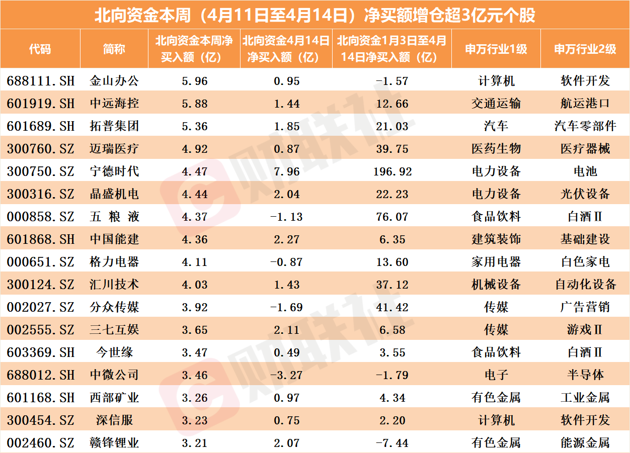 从周度(4月11日至14日)表现看,北向资金周净买额累计超3亿元的个股有17只(见下表)。金山办公、中远海控、拓普集团净买额均超5亿元;迈瑞医疗、宁德时代、晶盛机电、五粮液、中国能建、格力电器、汇川技术净买额均超4亿元。其中,宁德时代主要是在周五当天获得北向资金大买而使当周转为外资净流入。