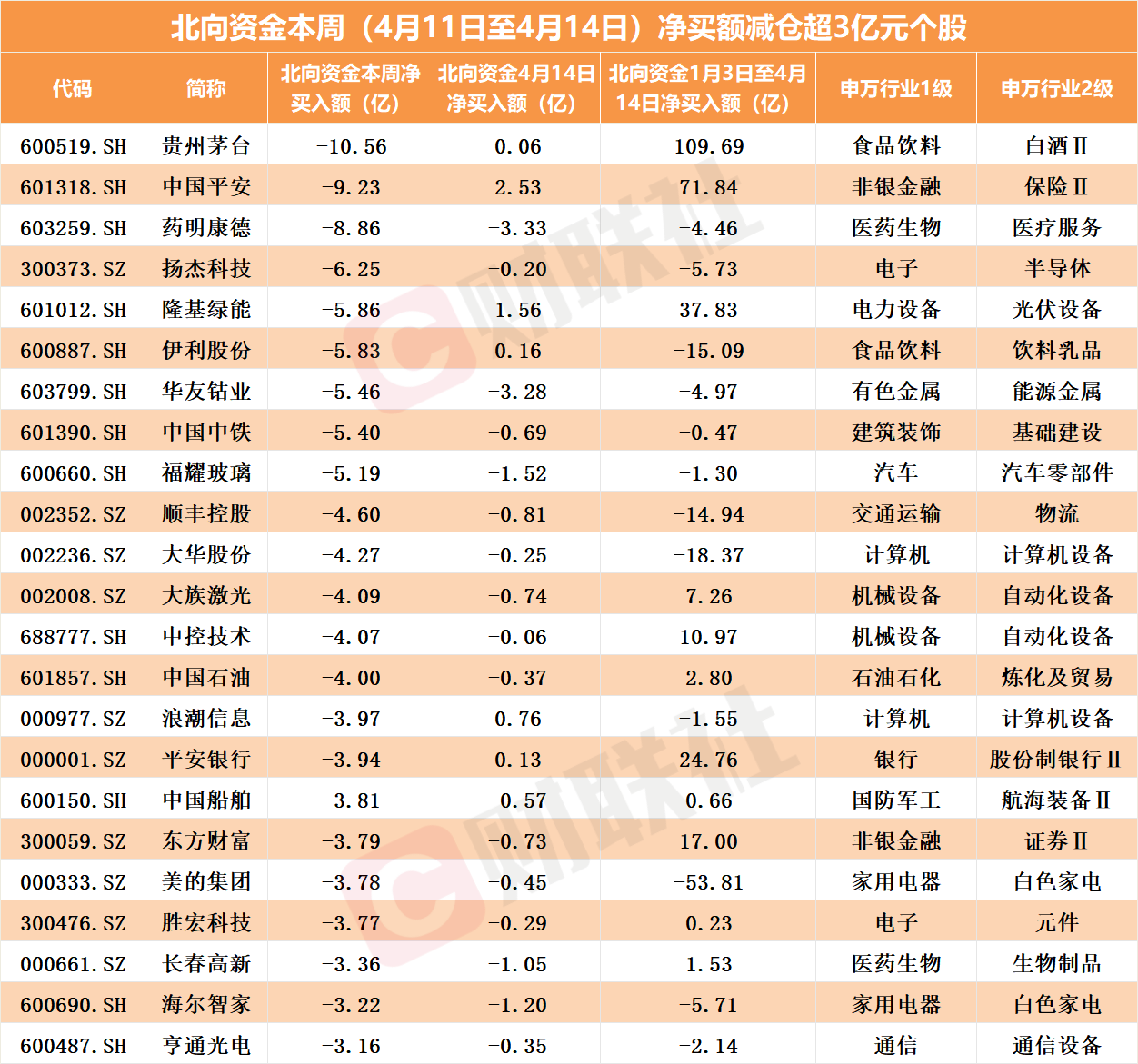 卖出方面,本周北向资金净卖出超3亿元的个股达23只(见下表)。其中,贵州茅台惨遭抛砸,净卖出额高达10.56亿元,中国平安、药明康德紧随其后,净卖出额分别为9.23亿元、8.86亿元。扬杰科技、隆基绿能、伊利股份、华友钴业、中国中铁、福耀玻璃净卖出额在5亿至6.3亿元之间。