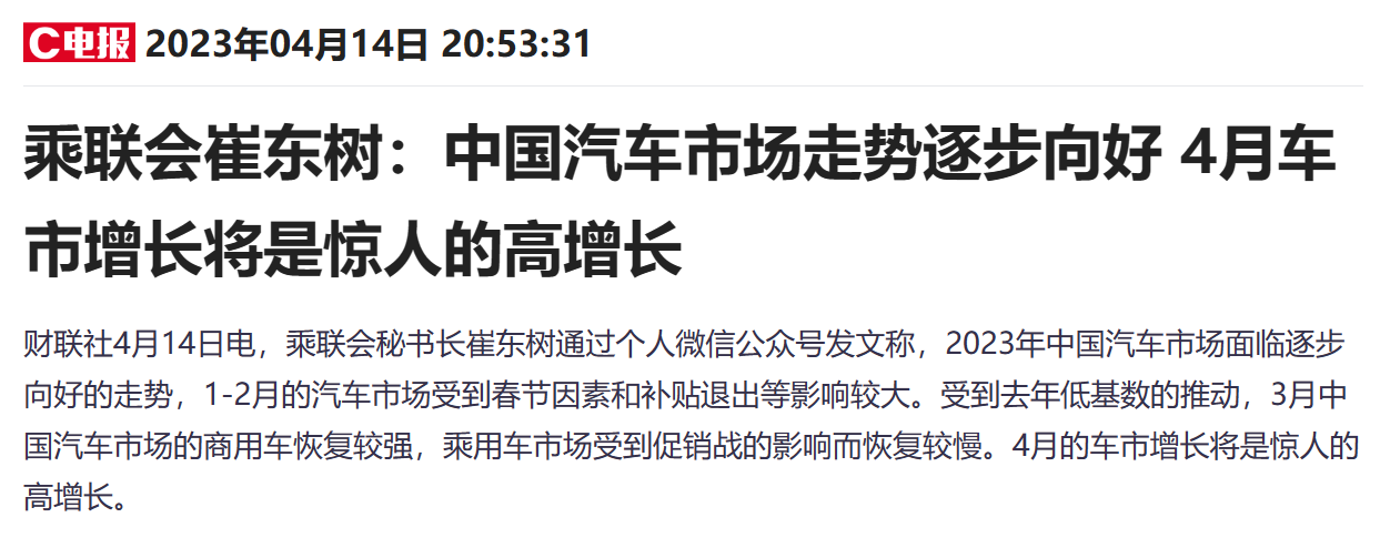 消息面上,乘联会秘书长崔东树4月14日通过个人微信公众号发文称,2023年中国汽车市场面临逐步向好的走势,1-2月的汽车市场受到春节因素和补贴退出等影响较大。受到去年低基数的推动,3月中国汽车市场的商用车恢复较强,乘用车市场受到促销战的影响而恢复较慢。4月的车市增长将是惊人的高增长。