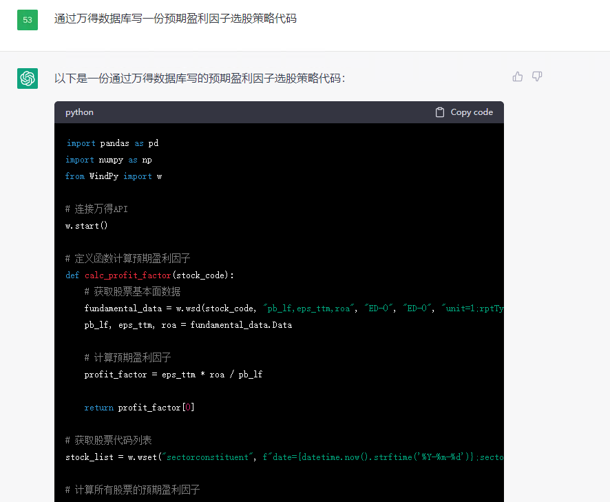 明泽投资证券交易部总经理刘的阳向记者举了一个例子。他向ChatGPT发送了一个“写一份预期盈利因子选股策略代码”的指令,而后ChatGPT为他返回了一串程序代码。