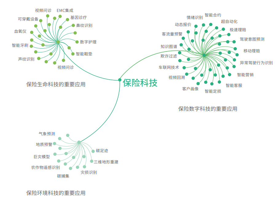 《白皮书》认为,保险科技从保险数字科技、生命科技、环境科技三个维度来影响保险行业。具体来说,保险数字科技是以大数据、云计算、物联网和人工智能、区块链等普遍适用于保险产品价值链中的技术,被认为是应用于保险行业最重要、最底层的科技;保险生命科技将数字科技与生命科技融合,从遗传、后天习性角度出发,防范或预测与疾病、养老和寿命相关的风险,其在健康险、养老险、寿险、宠物险、养殖险等领域有着重要的应用;保险环境科技则将数字技术与环境技术融合,用于防范、预测由洪涝、干旱、高温、地震等极端天气或海平面上升等气候模式驱动的物理风险,或用于防范、预测由绿色政策变化、绿色技术突破、绿色产品市场变化和声誉损失驱动的绿色转型风险。