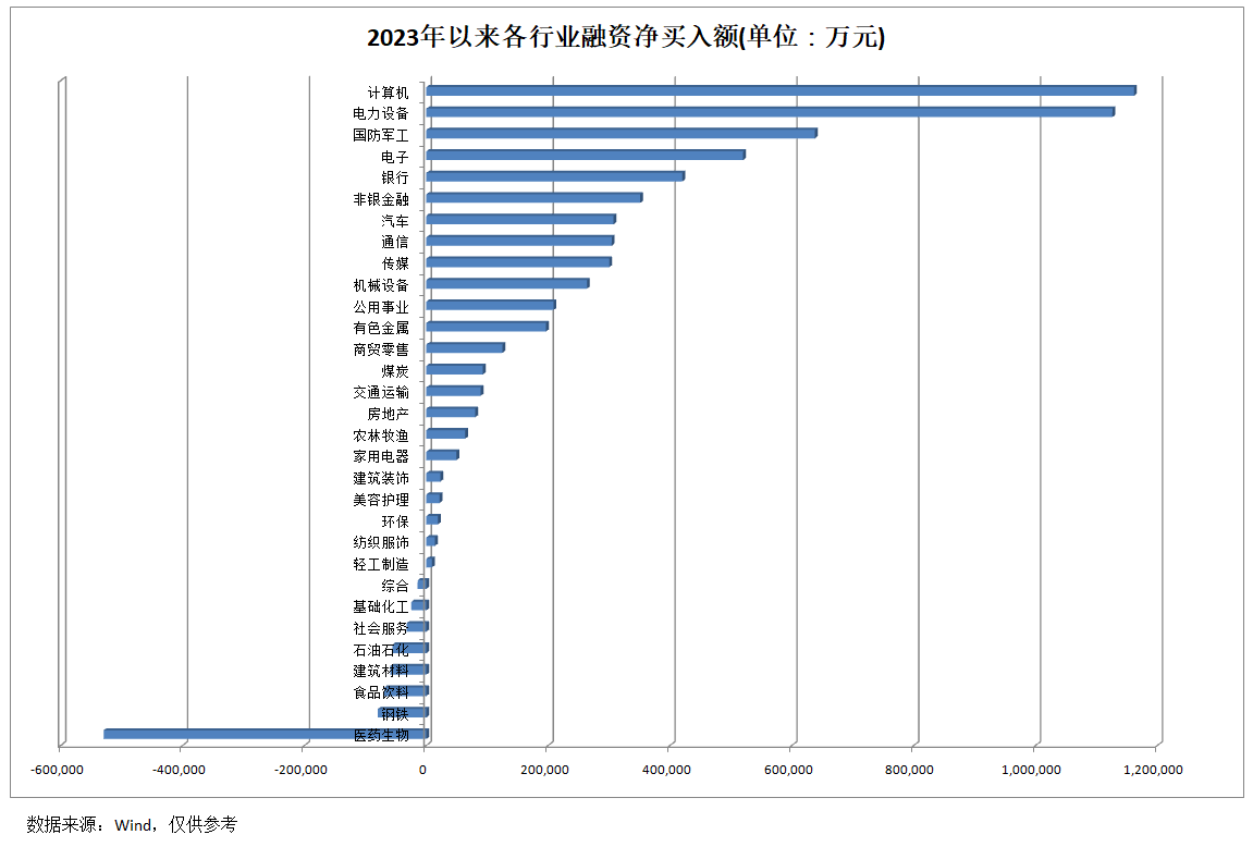 从上述数据来看,2023年以来,融资资金总体对A股市场进行了加仓操作,那么,具体来说,比较青睐哪些行业呢?