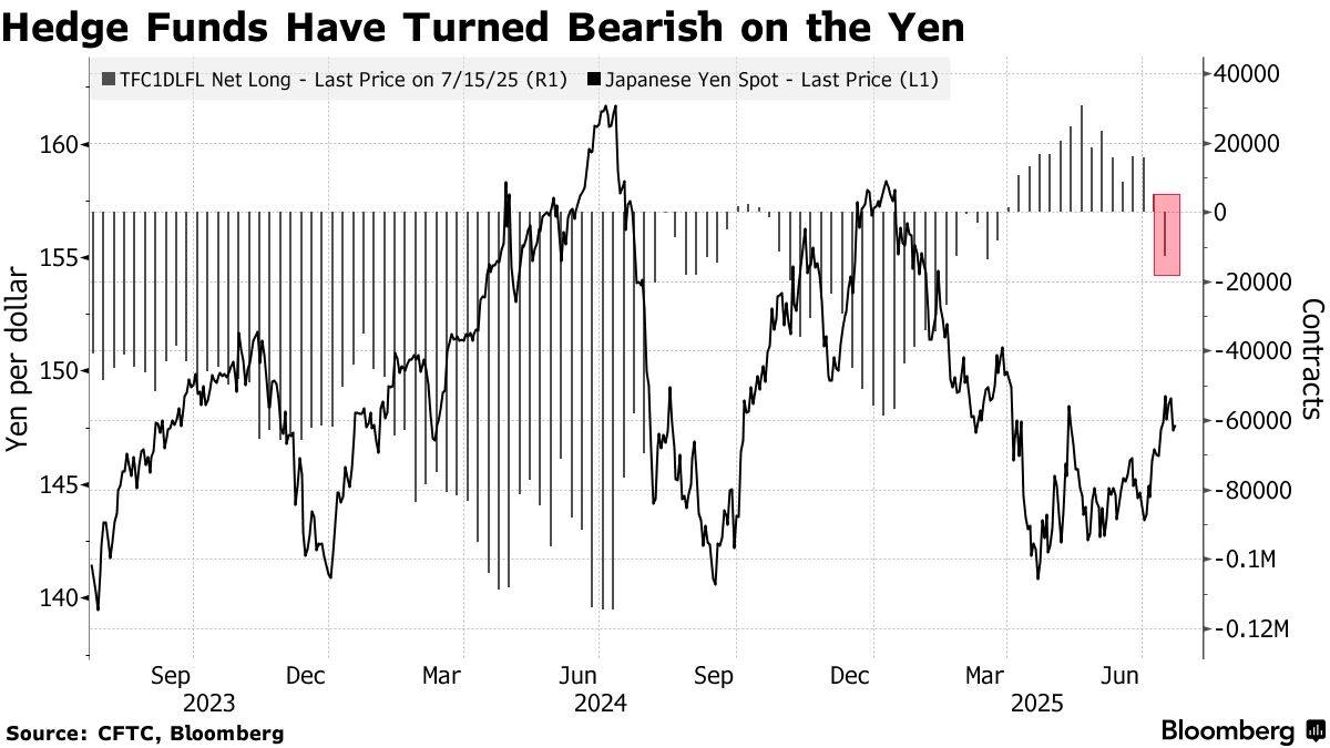 虽然无法准确衡量日元套利交易的资金规模,但现有数据表明该策略正重新流行。根据美国商品期货交易委员会(CFTC)7月15日当周的最新数据,对冲基金在近四个月内首次转为看空日元。同时,过去三个月,日元兑所有主要货币均出现贬值。