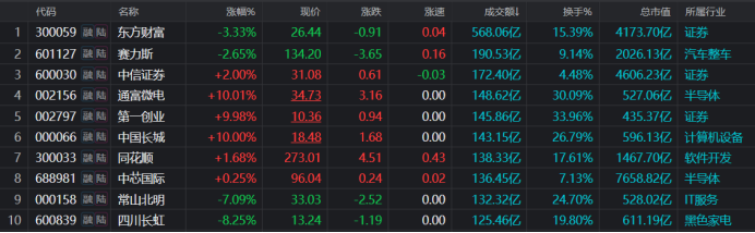 ①今日,东方财富尾盘跳水,盘中回撤近10%,全天成交额近568亿元,位居A股第一。