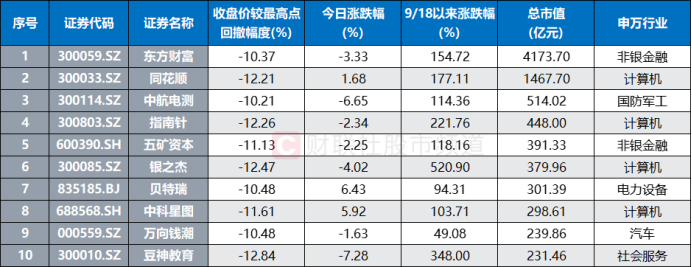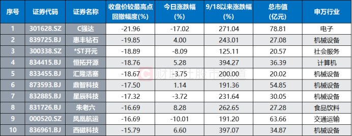 注:今日收盘价较盘中最高点回撤幅度超10%且总市值居前的个股(截至11月6日收盘)