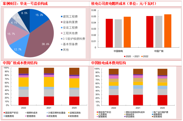 核电与水电类似,具有单位造价高、建设周期长的特点,因此对单个核电项目而言,折旧、财务费用是成本费用的主要组成部分。此外,核燃料费用也是核电成本费用的一个重要构成。