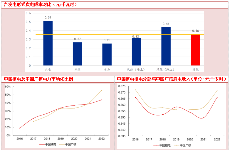随着电力市场化的持续推进,中国核电及中国广核市场化交易电量比例持续提升。2022年,随着煤电电价的上浮,各地市场化交易电价普遍上涨,核电电价也从中受益实现提升。