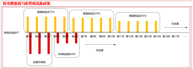 由于核电机组投产后享受不同的政策优惠,在不同的阶段优惠程度不同,主要包括增值税先征后退和所得税“三免三减半”。