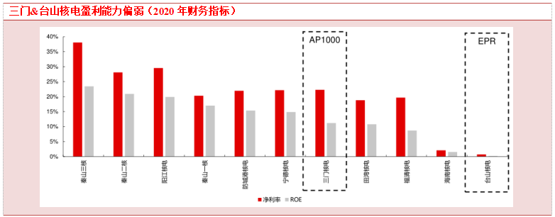 台山和三门核电项目均因为工程拖期等因素导致实际造价远高于项目预算,按照两家公司公开披露的项目投资额计算,台山核电首套首堆单位千瓦造价约为24518元/千瓦,三门核电首套首堆单位千瓦造价约为21496元/千瓦。高额造价不但使得年均折旧远高于正常水平,同时也带来了高额的财务费用,直接限制了项目的盈利能力。