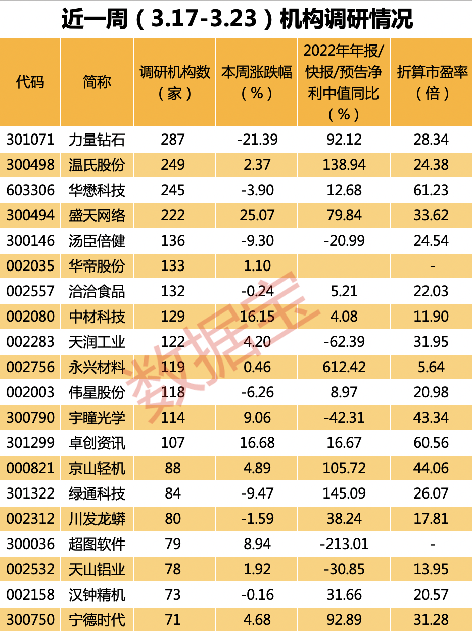 力量钻石成为近一周调研机构数量最多的股票,合计有超280家机构调研了该公司,包括69家基金、36家证券公司、54家私募、19家保险公司等。公司重点介绍了今年培育钻石行业的需求情况。