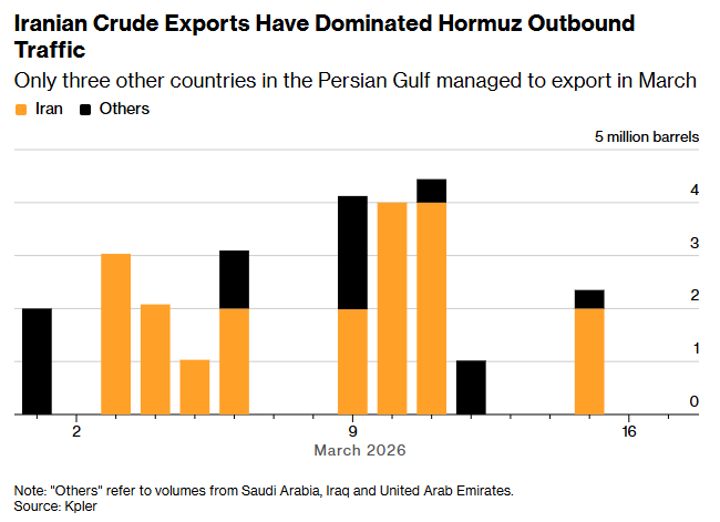 伊朗一直以与战前大致相当的规模通过霍尔木兹海峡运输本国原油,充分利用其对这条关键水道的控制,而其他该地区原油出口国则举步维艰。据情报公司Kpler的数据,自3月1日以来,离开波斯湾的2720万桶原油中,伊朗通过该水道的原油出口占了近四分之三。对伊朗来说,这相当于每天约120万桶,而战前每日水平为150万桶。相比之下,战争爆发近三周后,该地区其他国家的货运量加起来仅为每天40万桶,而战前平均每天为1400万桶。