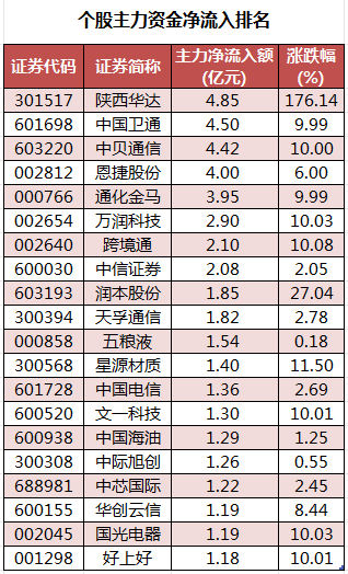 个股来看,今日有1976个股获主力资金净流入,其中,23股获主力资金净流入超1亿元。陕西华达获主力资金净流入最多,净流入金额为4.85亿元;主力资金净流入居前的个股还有中国卫通、中贝通信、恩捷股份、通化金马、万润科技,流入金额分别为4.5亿元、4.42亿元、4亿元、3.95亿元、2.9亿元。