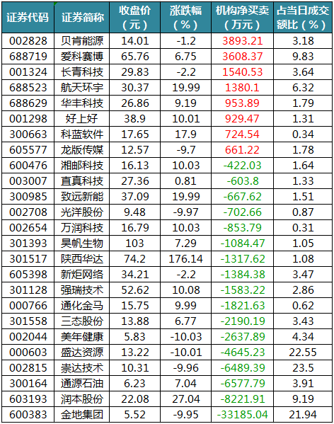 盘后龙虎榜数据显示,今日机构席位资金合计净卖出约6.07亿元。其中,净买入的个股8只,净卖出的个股17只。机构净买入最多的股票是贝肯能源,净买入金额约3893.21万元;机构净买入居前的还有爱科赛博、长青科技等股。机构净卖出最多的股票是金地集团,净卖出金额约3.32亿元;机构净卖出居前的还有润本股份、通源石油、崇达技术等股。