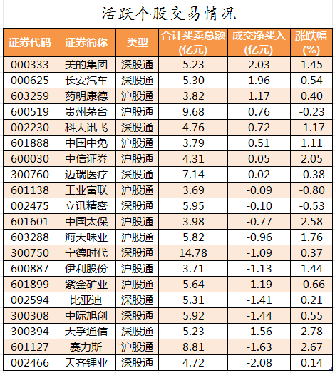 活跃个股方面,北向资金今日净买入较多的有美的集团、长安汽车、药明康德、贵州茅台、科大讯飞,净买入金额分别为2.03亿元、1.96亿元、1.17亿元、0.76亿元、0.72亿元。北向资金净卖出较多的有天齐锂业、赛力斯、天孚通信、中际旭创、比亚迪,净卖出金额分别为2.08亿元、1.63亿元、1.56亿元、1.44亿元、1.41亿元。