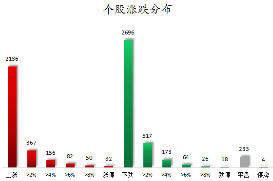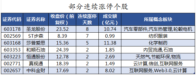 截至收盘,沪深两市合计2136个股上涨,2696只个股下跌,平盘个股233只,停牌的个股4只。不含当日上市新股,共有32只个股涨停,18只个股跌停。续涨停天数看,圣龙股份均已连收8个涨停板,连续涨停板数量最多。